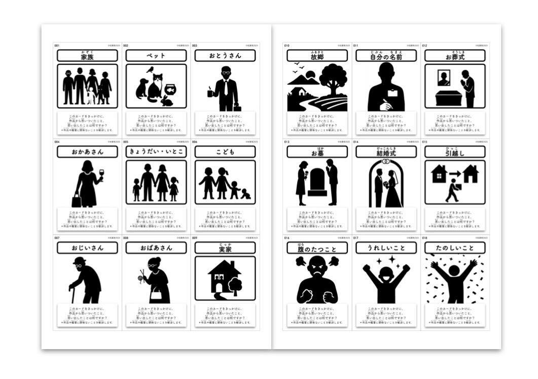 記憶や体験にまつわる「カード」と、目の前の「作品」。一見無関係に思える2つをつなげ、そのつながりを想像するうちに、いつのまにか発想がひらかれ、感じ方や考え方の枠が広がっていきます。